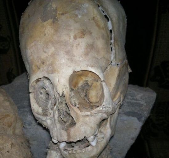 据英国《每日邮报》网站11月19日报道,这两具干尸是由秘鲁东南部库斯科一家博物馆的工作人员雷纳托·达维拉·里克尔姆在曲斯皮坎奇省南部城市安塔瓦伊利拉发现的。据里克尔姆描述,其中一具干尸的头骨巨大(如图),长度和其下面的身体部分相当,均为50厘米,该头骨形状怪异,上面深陷的眼窝比正常人的大很多,顶部有一块柔软的部分,类似婴儿出生时头顶没有骨质的囟门。嘴部长两颗巨大臼齿,而这种牙齿一般只有上了年纪的人才会长。