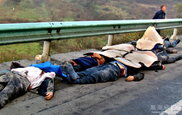 11月28日清晨6点20分许,贵毕公路179公里处,一辆载有7人的猎豹车与爆胎停在路中的一辆大货车猛烈追尾相撞,当场造成猎豹车内的6人死亡1人重伤。据了解,越野车是贵州省纳雍县某乡政府的车辆,身亡男子李某系该乡连任几届的新当选乡长,其中死者中3人为亲兄弟。图为6名死者对遗体被临时移放到公路边等待运走。